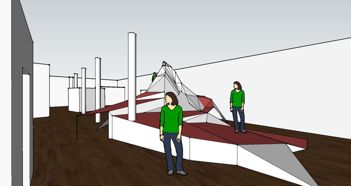 Zentrales Anliegen war die Auseinandersetzung mit Größenverhältnissen von Werk und Betrachtern im Raum. Die begehbare, von uns selbst gebaute und mit Versatzstücken von typischen Oberflächen in Ohio gedeckte Replik des Matterhorns, ist zu groß für den Raum, doch von Personen bespielt, wirkt sie klein. Genauso experimentierte Christian Manss mit unterschiedlichen Formaten für das gleiche Werk und welchen Einfluss das Format und der Umraum auf die Bildwirkung hat.